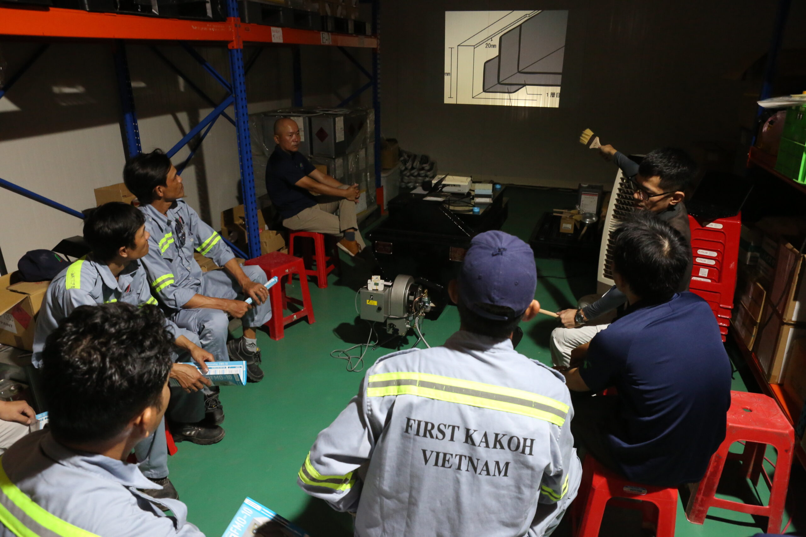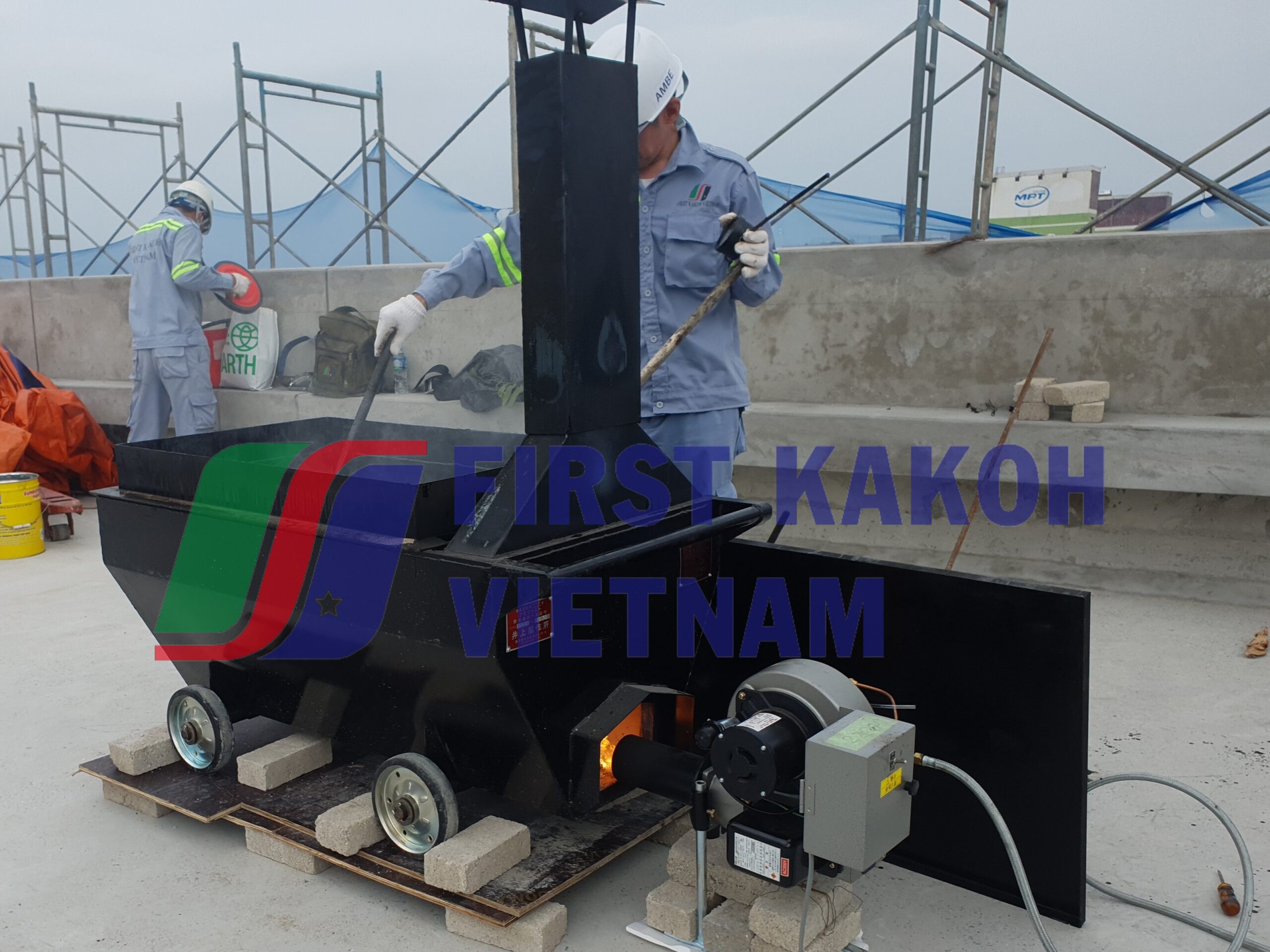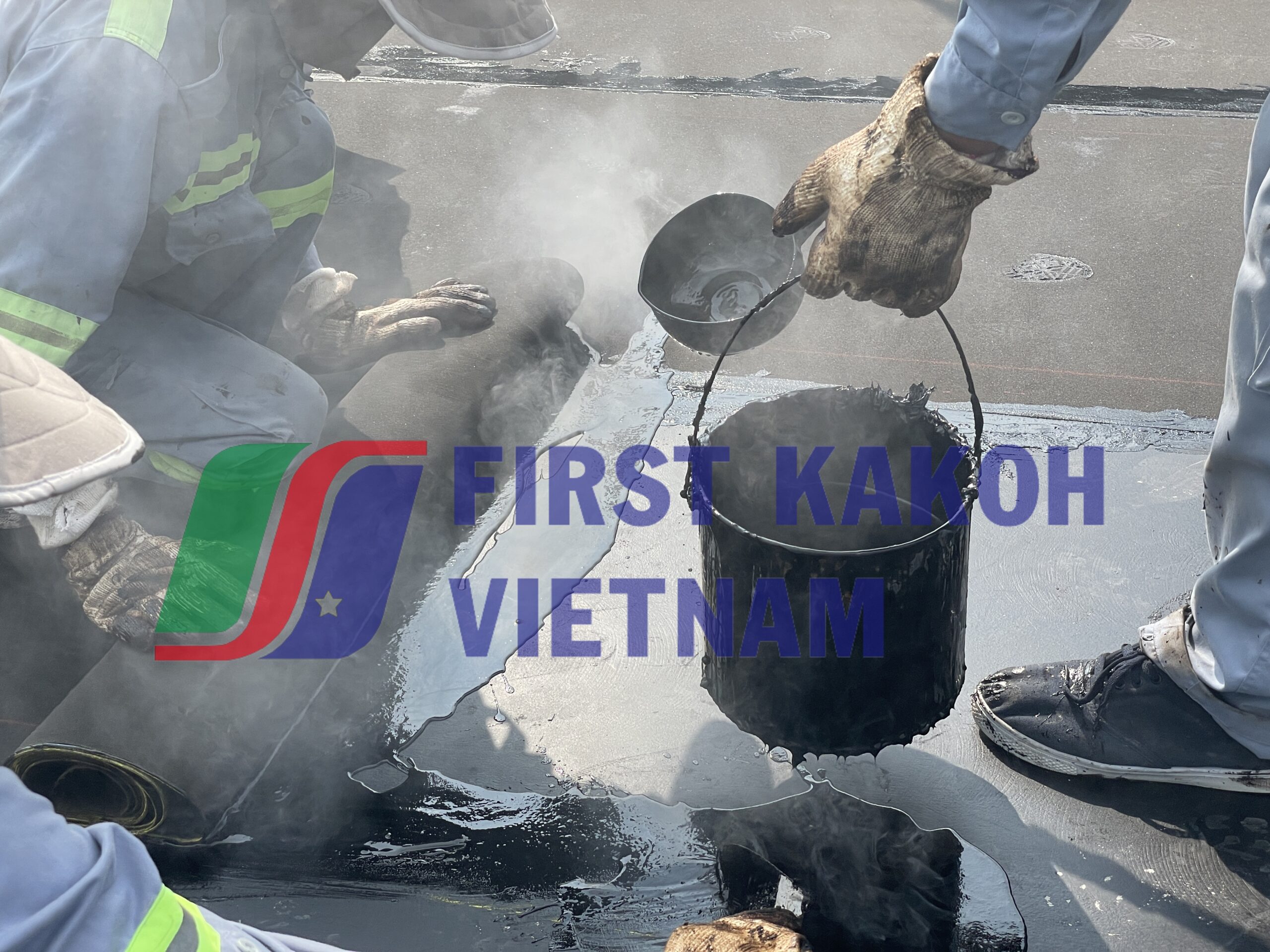 今回取り扱いを始めた防水材は従来ベトナムで一般的な「トーチ工法」と異なり、「熱工法」と呼ばれる工法で施工をする材料となります。「熱工法」とは改質アスファルトコンパウンドを溶融窯を用いて現場にて溶融し、溶融アスファルトにてアスファルトシートを下地へ貼り付ける工法です。改質アスファルトの溶融を1か所の溶融窯で溶融の管理を行うことで、従来の「トーチ工法」において一番の懸念点であった「改質アスファルトシートの炙り不足による接着不良」のリスクを大幅に軽減することが可能となりました。